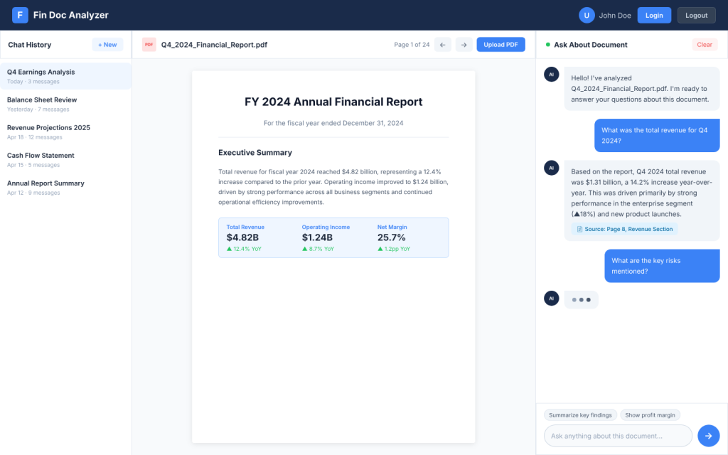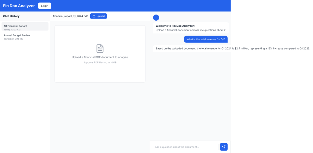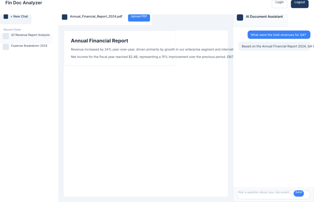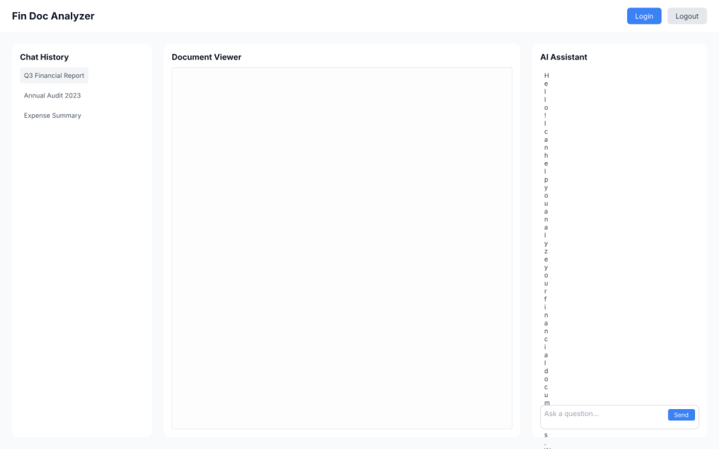 - Create a header section with company name "Fin Doc Analyzer" on the left and login/logout buttons on the right