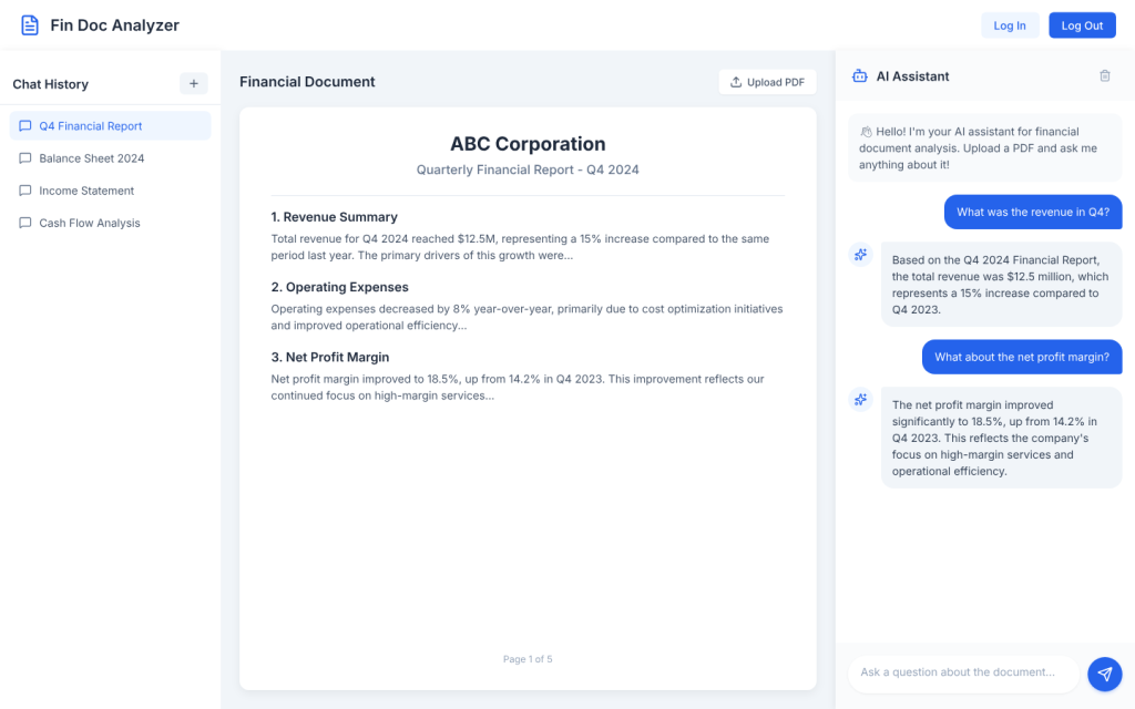 - Create a document viewer section in the center which shows the uploaded financial pdf document