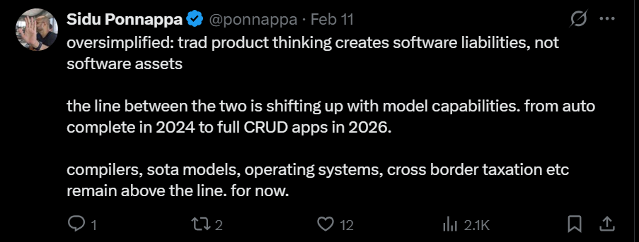 Traditional product thinking (“ship features; build big codebases”) increasingly creates software liabilities, not durable software assets.