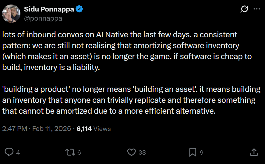 This post breaks down a core idea: as AI makes software cheaper and faster to build, “software inventory” (features/code) can shift from asset to liability—and what that means for startup strategy: moats, pricing, and what to build (or avoid).